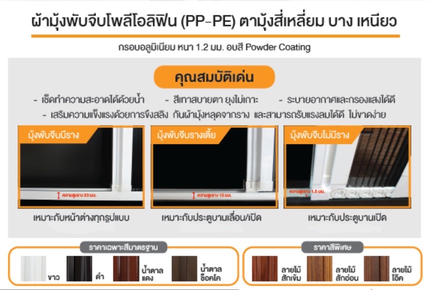 สร้างมุมมองใหม่ที่สะอาดตา สวยเข้าชุดกับประตู-หน้าต่าง ด้วยมุ้งพับจีบโพลีโอลิฟิน (PP-PE) ตามุ้งสี่เหลี่ยม บาง เหนียว กรอบอลูมิเนียมสีพ่นอบ มีให้เลือก 2 รูปแบบ และหลากหลายสี